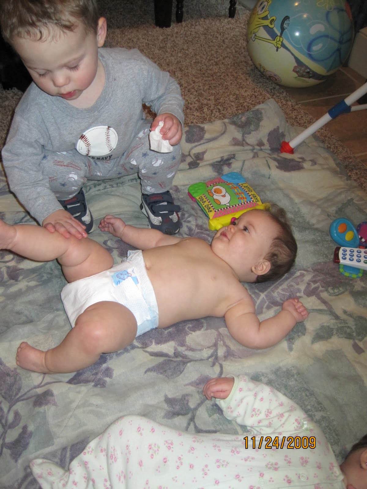 I'm multi-tasking- loving on Val while feeding Nessa.